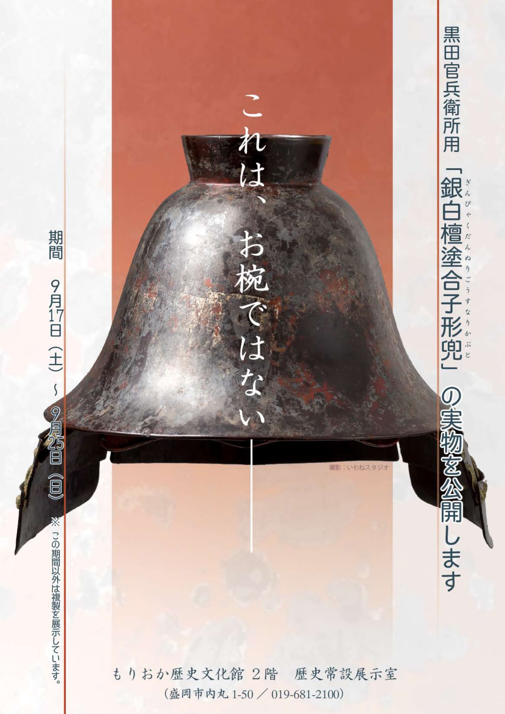 有些資料是旅行完才查的,原來朱塗合子形兜原本是赤色的,後來黑田官兵衛把它塗成銀色,因此這並不是本物,真正的銀白檀塗合子形兜展示在盛岡歷史文化館,似乎是因為黑田騷動的歷史動亂下,輾轉經由栗山大膳獻給了盛岡藩主。