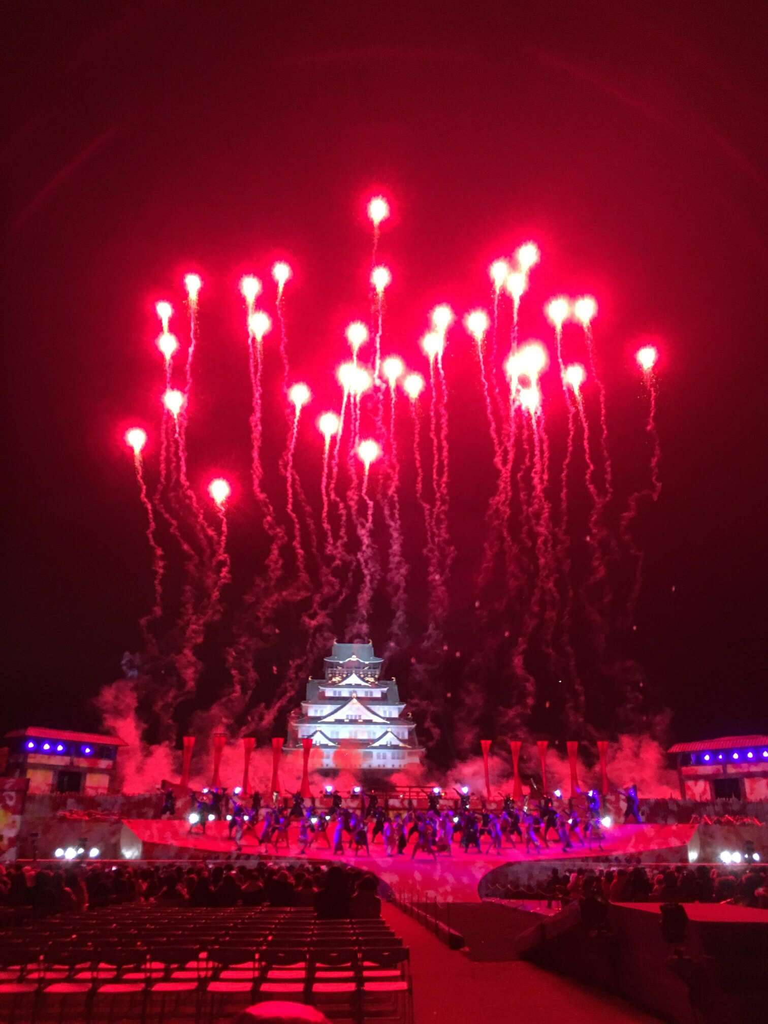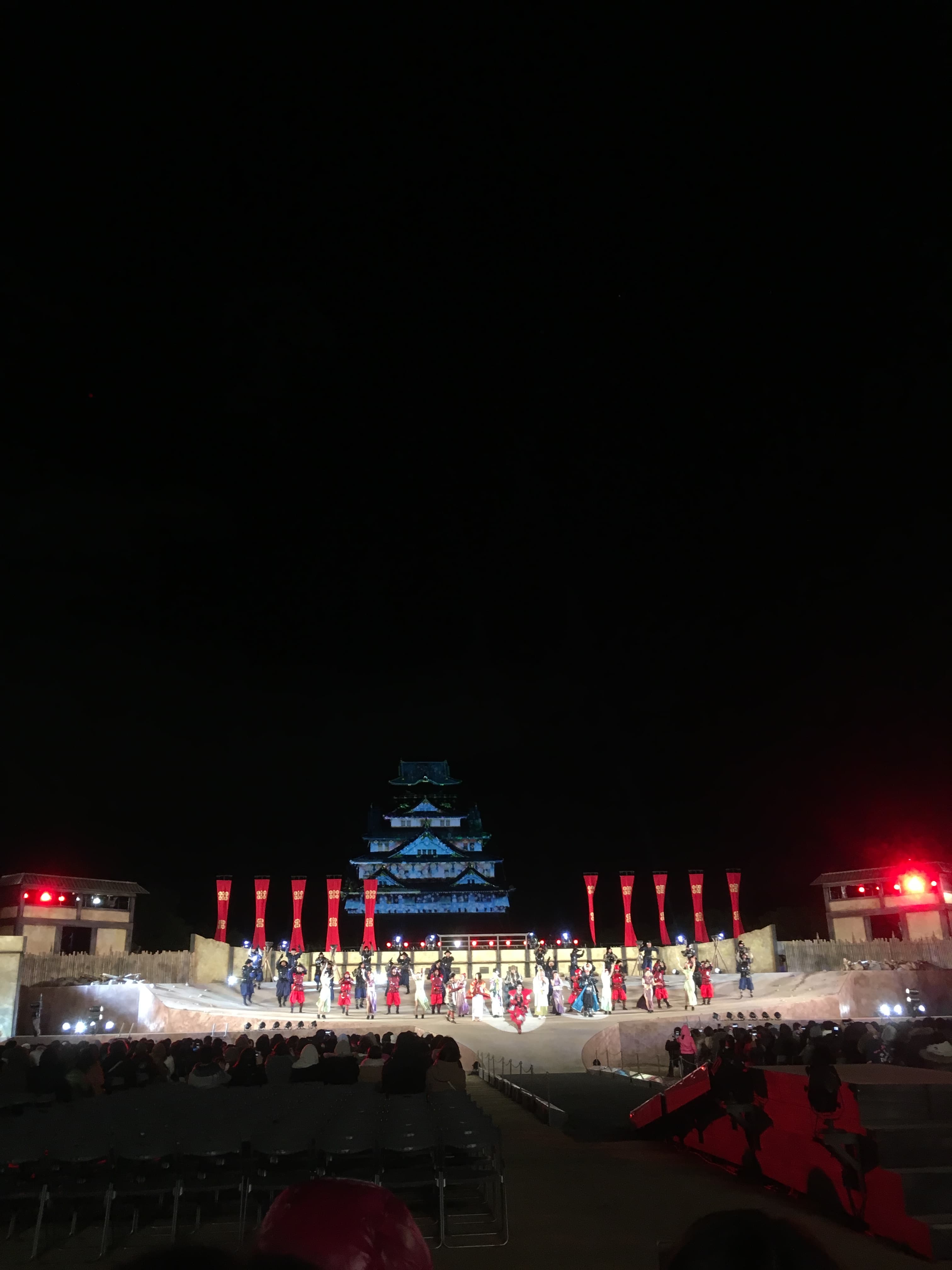 晚上步入會場,大阪城於昏暗的夜裡顯得格外莊嚴,我們坐在中間偏後面的位置,視野還不錯能夠看到整個場景,坐在寒風中,期待著真田幸村的身影。